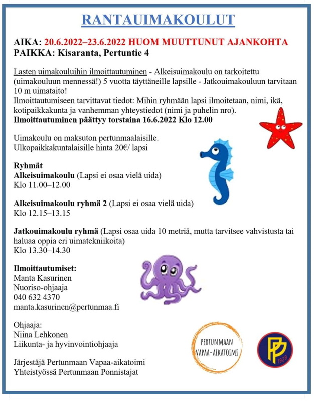 HUOM! Muuttunut aikataulu. Rantauimakoulut 20-23.6.2022 Kisarannassa, Pertunmaalla.